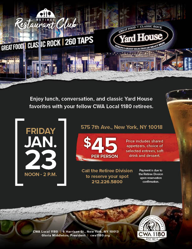 Fri. 1/23 | Restaurant Club at Yard House $45/person includes shared appetizers, choice of selected entrees, soft drink and dessert. | Yard House Call the Retiree Division to reserve your spot today: 212.226.5800 |