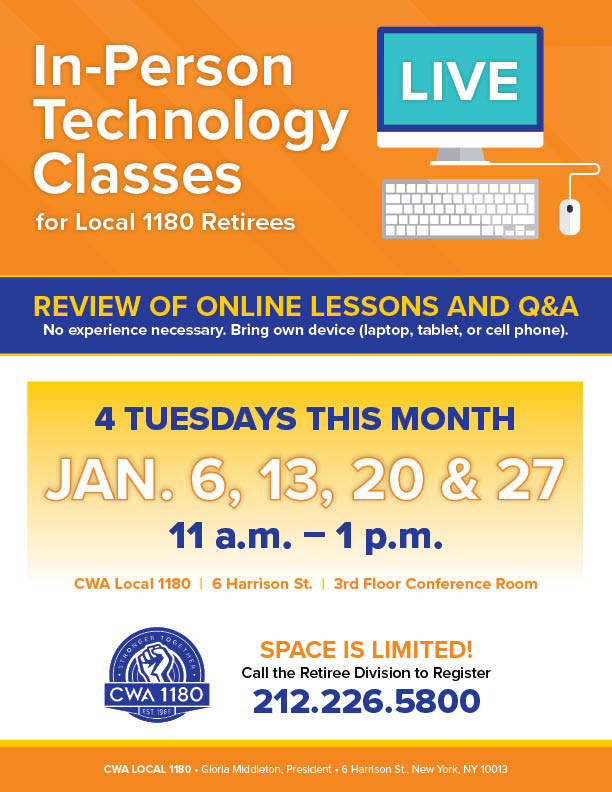 | Tues. 1/6 | IN-PERSON Review of Online Lessons / Q&A | 6 Harrison St. Call the Retiree Division to reserve your spot today: 212.226.5800 |